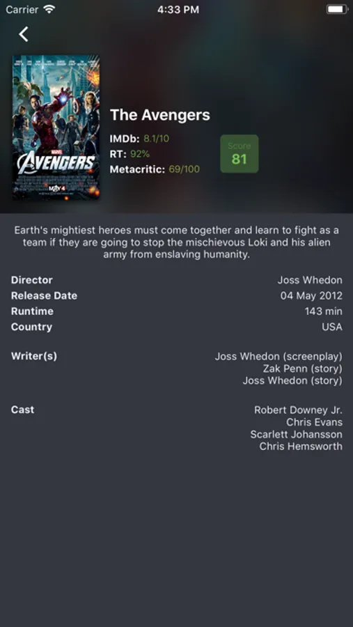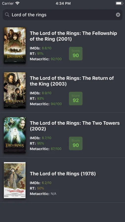 Movie Ratings allows you to quickly look up a movie's IMDb, Rotten Tomatoes and Metacritic scores with a minimalistic and efficient interface. Furthermore, search results can be opened to get additional information about the movies.