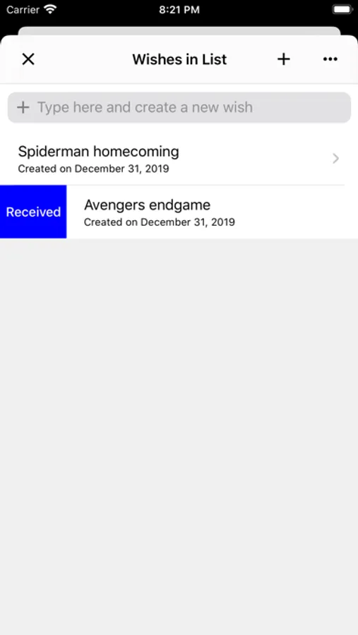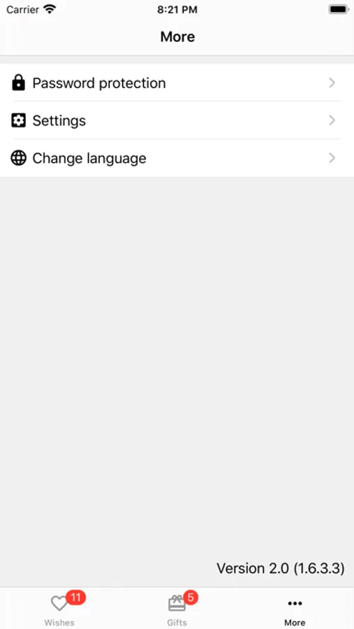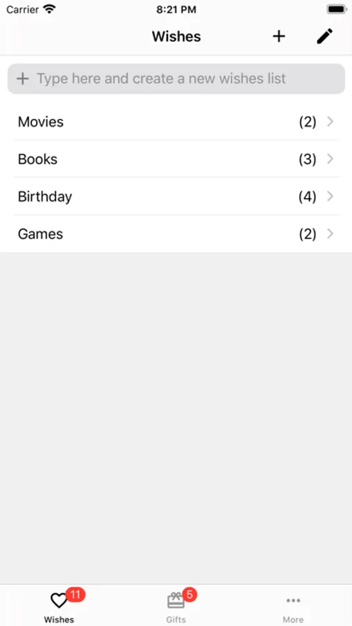 The app splits the lists into Wishes (items I want) and Gifts (items for someone).
