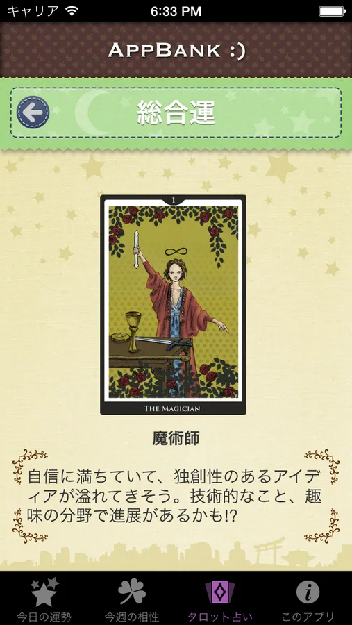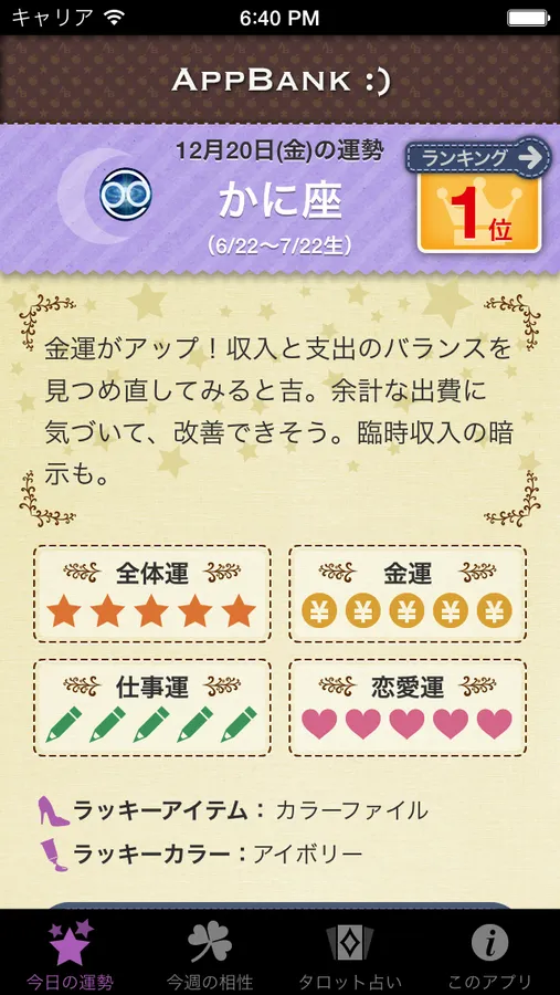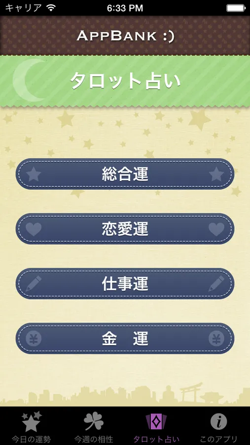 全体運・恋愛運・仕事運・金運がチェックできます。