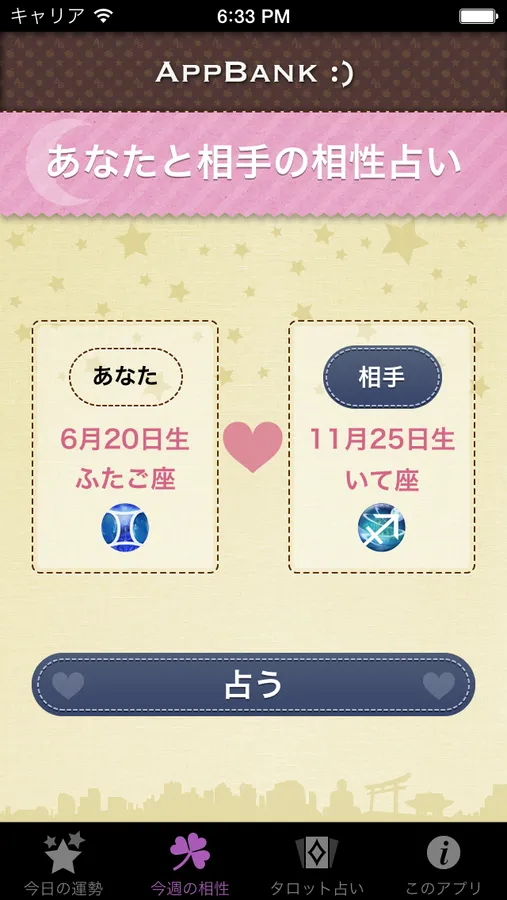 今日の運勢 は、あなたの運勢を毎日教えてくれます!ランキング形式であなたが何位なのかすぐにわかっちゃう。気になるあの人との相性占いも楽しめます^^