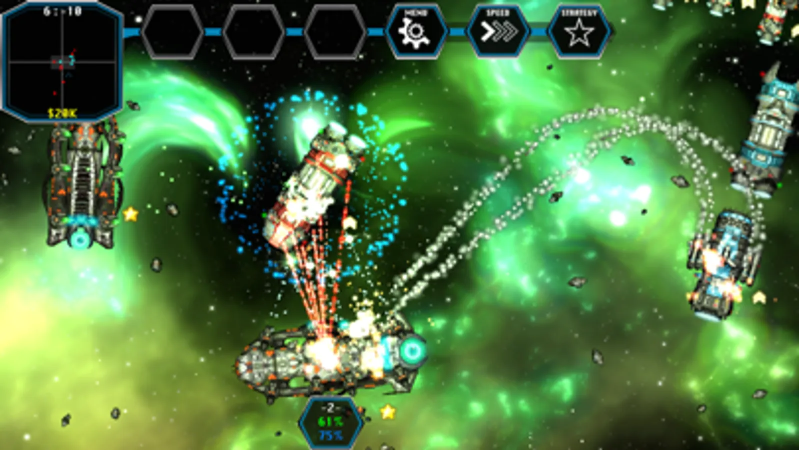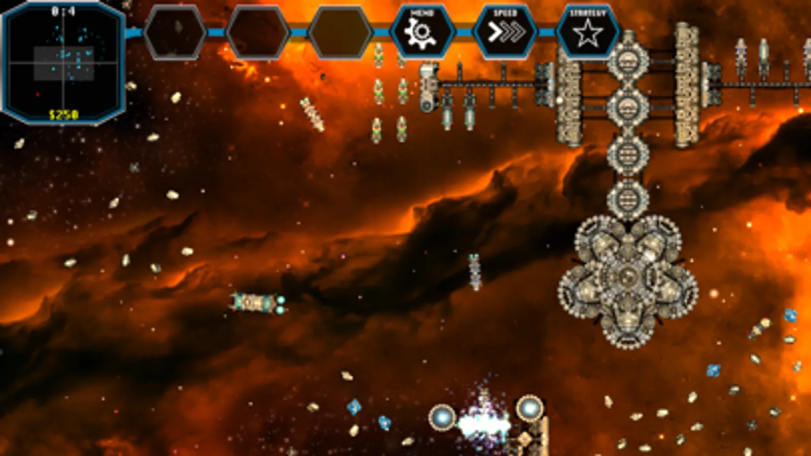 • Harvest resources to buy new ships, power-ups and upgrade your mothership