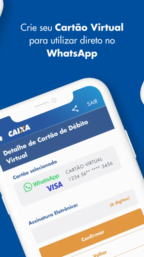 • Criar cartão de débito virtual para usar em pagamentos via Whatsapp e em compras online;
