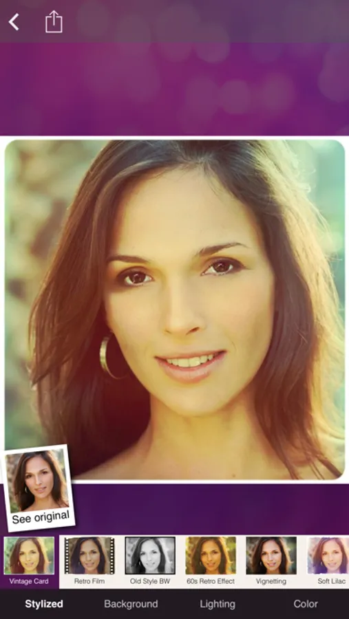 After automatic enhancement has been performed, you can compare the before and after photos to evaluate the changes. Meticulous users can tweak the settings (exclude some options they think unnecessary). What's more, you can apply various artistic effects to your retouched photos to make them look more appealing. Enhance a portrait with a soft focus 'Glamour' effect, or use 'Retro Sepia' and 'Black & White' effects to vintage your photos. Also try awesome background effects for a bit of a festive look. Finally, share your enhanced photos with the world via Facebook, Twitter and e-mail or save it to your photo album.