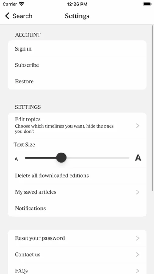 When viewing a paper or supplement, you can pinch and zoom to enlarge the pages and articles, swipe through or jump to the next or other pages, use the search functionality to find specific articles, and view full pages either in single page portrait or double page spread landscape mode.