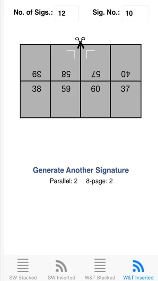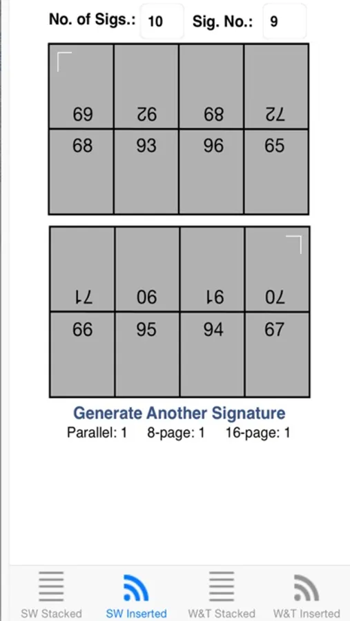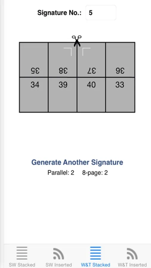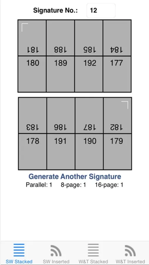 This app generates 8-up imposition diagrams without any page count limitations. Signatures can be imposed according to the four major imposition methods: