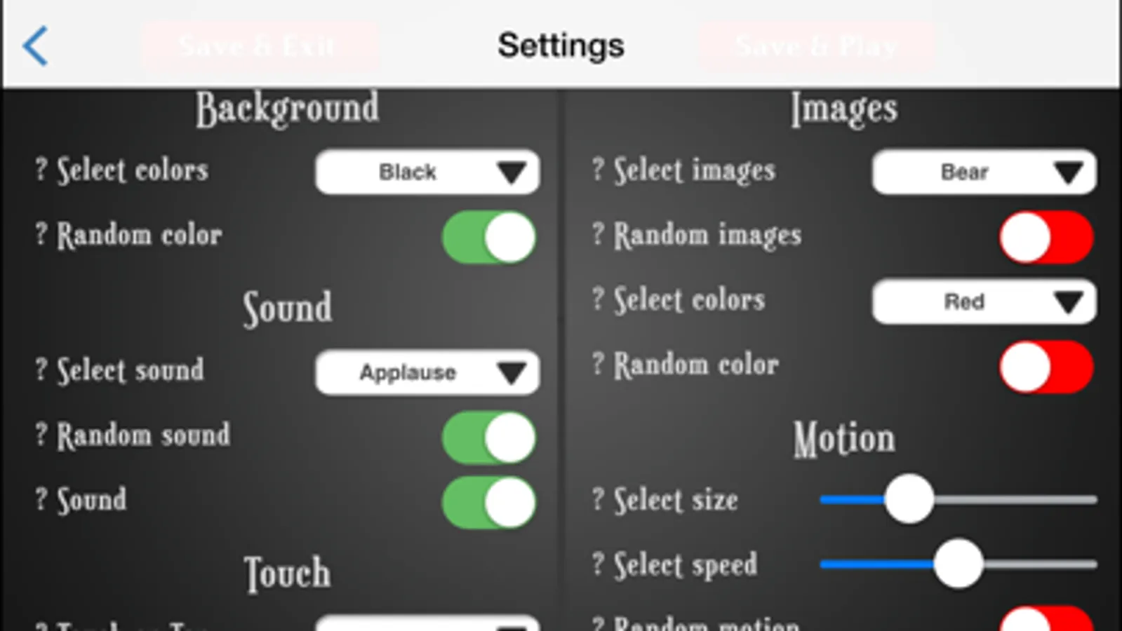 All aspects of the app are fully customizable to meet your child's needs. Both the animals and background can be set to your child's preferred color. Particular images can be chosen to adapt to the level of complexity that works best for your child. How you interact with the image and what kind of reward is triggered is also highly customizable.