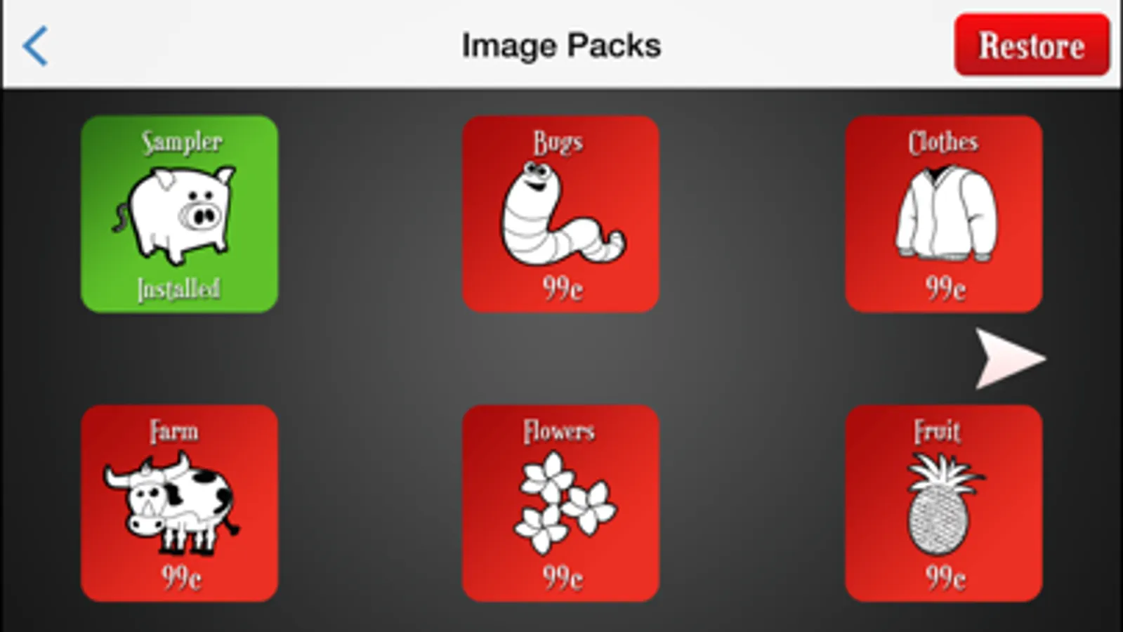 Adorable hand-drawn images dance around the screen one at a time, appealing to a child's preference for movement. The use of a single image against a solid background helps eliminate visual clutter while the use of highly saturated colors makes the image easier to see. Touching the image results in a reward sound as the image grows in size.