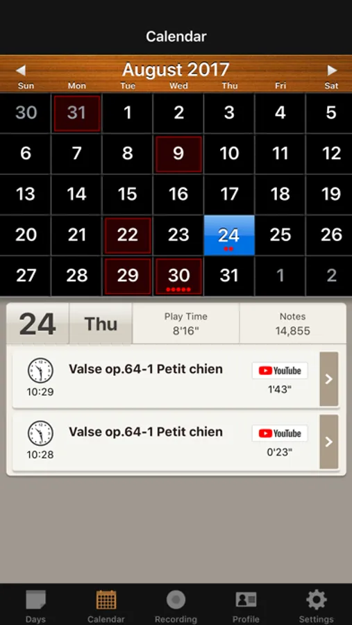 Do you want to monitor your practice time precisely? Piano Diary will keep track of all important statistics, such as how long you have been playing and how many notes you have played. You can even compare your practice time to other users of Piano Diary.