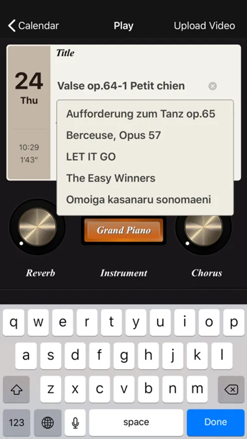 No need to carry your instrument with you! You can listen to your performance from the iPhone/iPad using the Piano Diary software synthesizer. Enjoy your performances whenever and wherever you are - from the iPhone/iPad or over the Internet from shared YouTube movies.