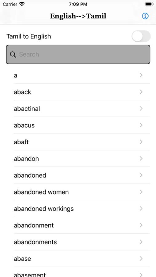 Best English to Tamil dictionary in the market. It has a free Word jumble game. It has more than 32549 english words with Tamil meanings, synonyms and antonyms. It has voice enabled pronunciation for english words and doesn't need internet connection. Predictive search will make your life easier.