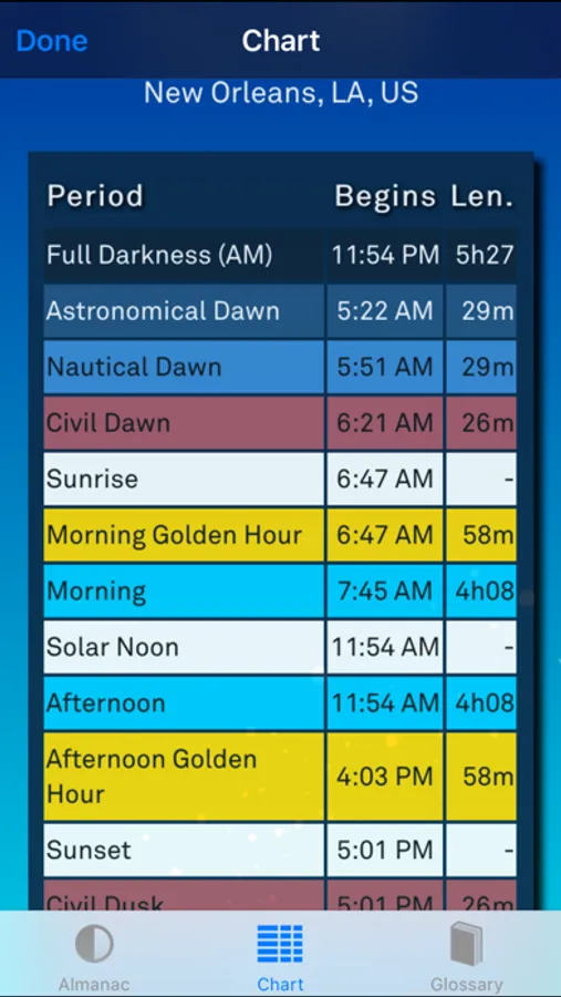 * Detailed almanac information: Useful information about the day's length, sun's azimuth and elevation, equinoxes and solstices, and a friendly glossary that explains all the terms.