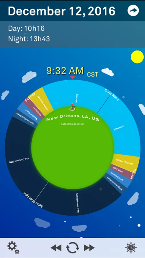 * Automatic Location: Sol not only calculates the amount of daylight and sunrise and sunset times, but does so for any location in the world (both Northern and Southern hemispheres) by using your device's GPS... no network connection required.