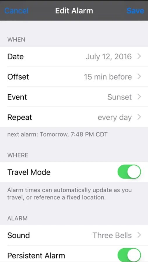 * Optional location-aware alarms. Sol knows when you change with your location; and as you travel it will adjust any alarms you set relative to sunrise and sunset times. Create alarms for multiple locations around the world.