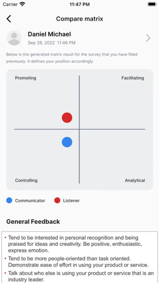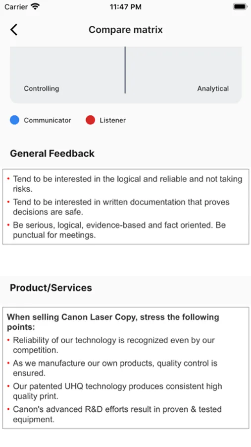 This application is for use by people who have been attended in one or more of the Persona GLOBAL Persuasive Communicator™ Series Workshops. The Persona GLOBAL Gameplan mobile application is an interpersonal communications expert profiling system enabling the user to be more effective in achieving their communication goals. After answering 16 questions using a “slider”, an algorithm calculates a position on a communication style matrix and recommends 5 important key points the user needs to emphasize with the person being profiled in order to establish a trusting relationship while achieving the desired results. Product, Service, or Idea benefits can be programmed into the Gameplan application. Available in multiple languages. Recommended/Designed for those involved in Sales, Negotiations, and Management roles.