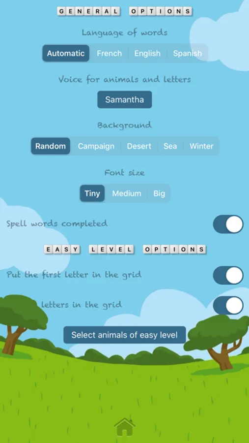 - Three levels of difficulty with an easy level fully customizable (font size, animals ...)