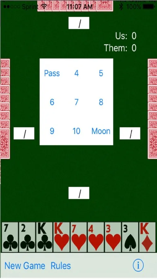Settings allow you to set the minimum bid, winning score, and to disable shoot the moon bids.