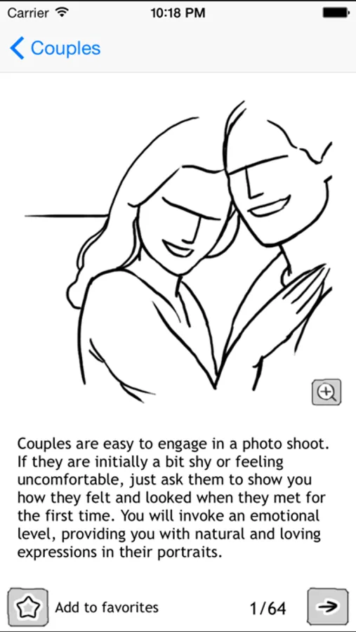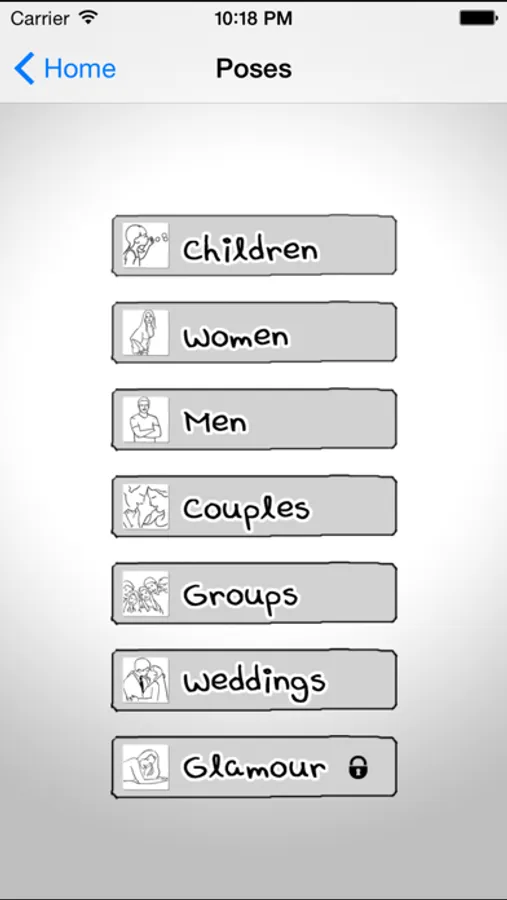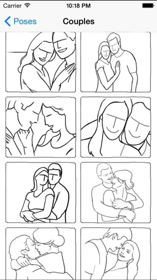 A variety of posing categories are available in Posing App: Children, Couples, Women, Men, Groups and Weddings. Over 300 poses are included offering a wide choice in any modeling scenario. A special Glamour section is available as in-app purchase including additional 86 carefully selected glamour poses for female models. While browsing the poses, use the "Add to favorites" feature for fast access during a photo shoot.
