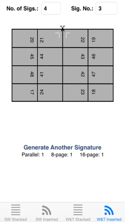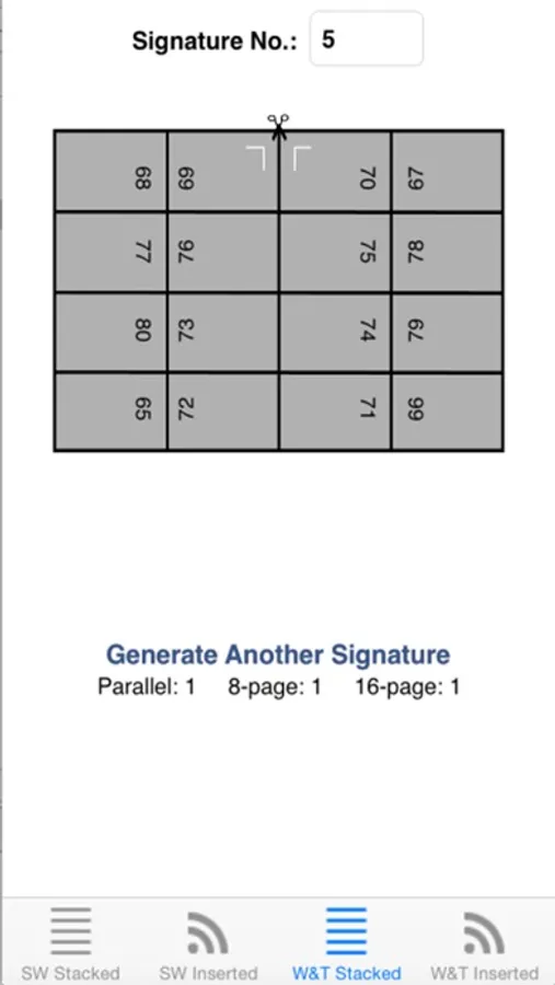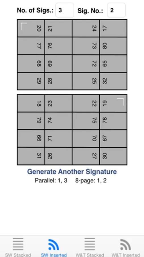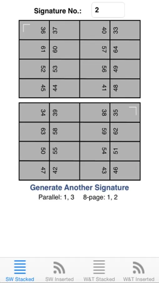 This app generates 16-up imposition diagrams without any page count limitations. Signatures are imposed according to the four major imposition methods:
