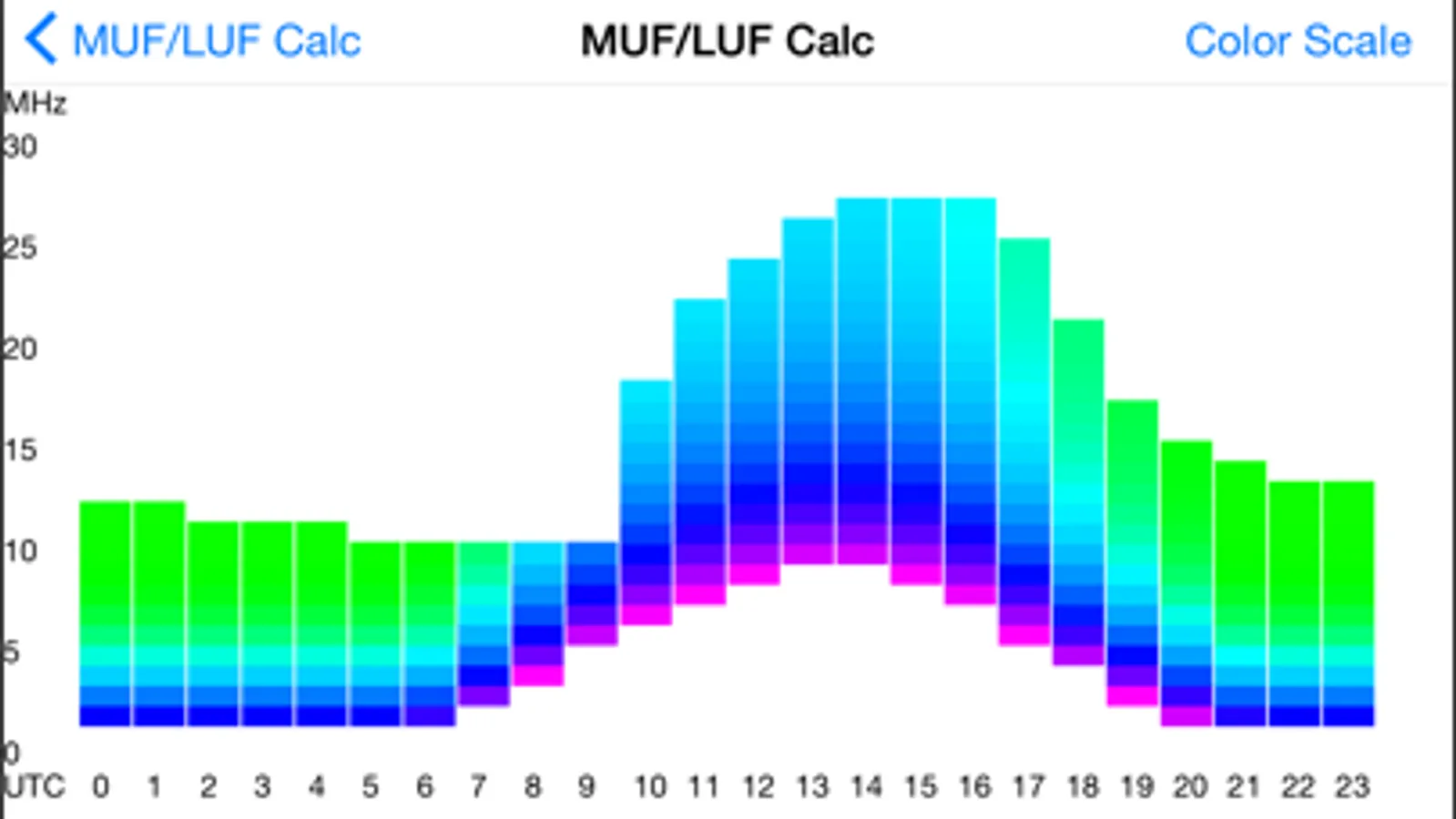 Radio propagation conditions can also be estimated between any two points on the Earth. Graphs of these conditions can be generated for a given frequency or time, and MUF/LUF graphs can also be displayed.