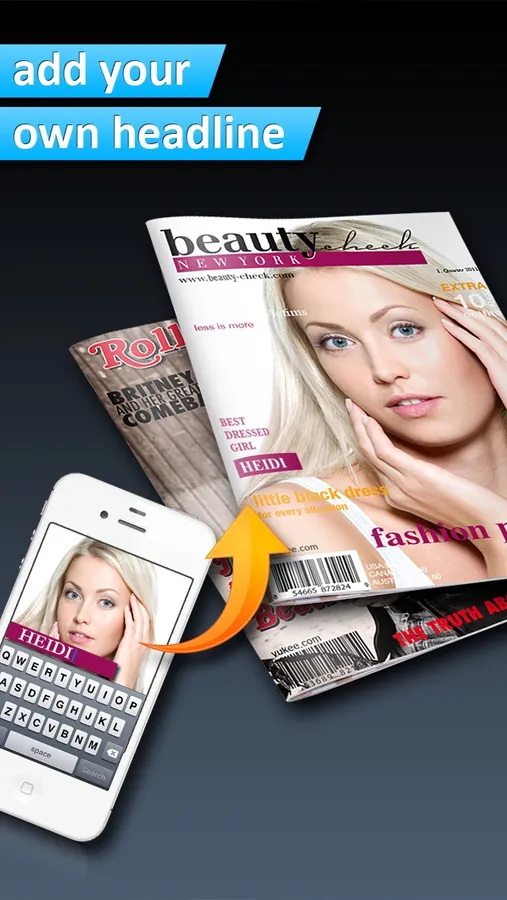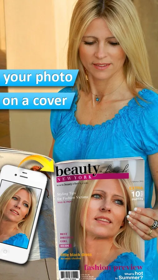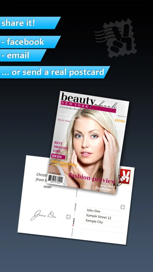 Be a star and create a celebrity cover of your own. Write your own headline to get your famous magazine! Create your photo cover in 3 clicks which you can then send directly via email, save in the library, post on Facebook or sent by postcard - Whatever photos you want to send, with Photo2Cover your images are placed in the spotlight of publicity