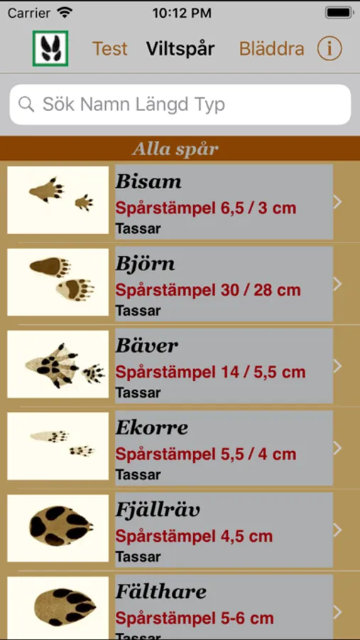 - Sökning bland djuren i listan kan göras automatiskt med avseende på djurets art, spårlängd eller spårtyp.