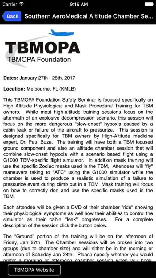 The TBMOPA Directory provides TBM Owners, Daher Staff and Distributors with mobile access to the TBMOPA Member Directory, TBMOPA Events Schedule and a Daher service listing. You must have a TBMOPA username and password with a valid subscription to use this application.