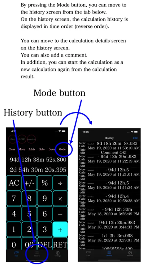The calculation result is automatically recorded in the history screen. The date and time at the time of calculation are recorded, so you can find it immediately.