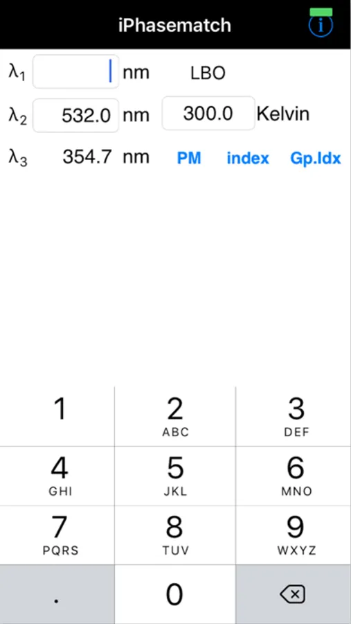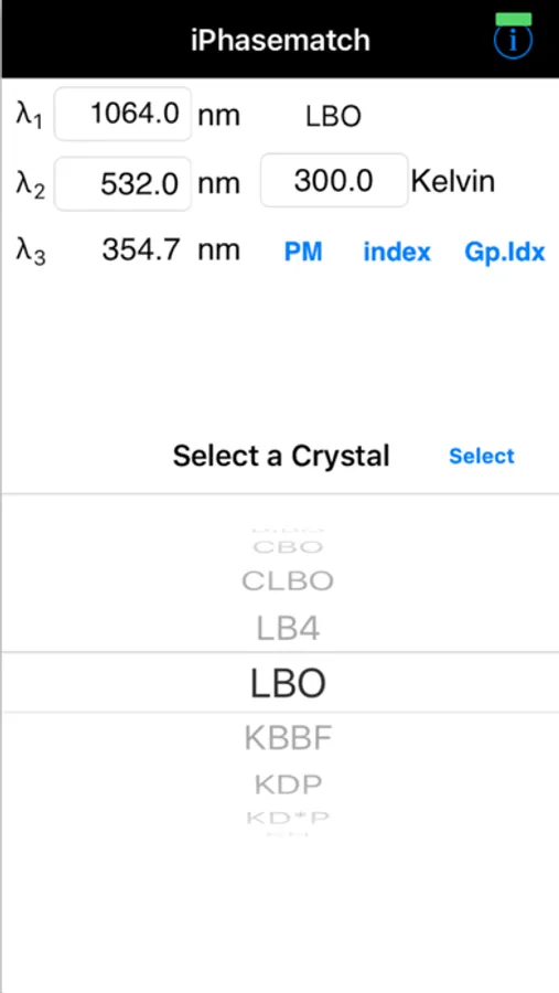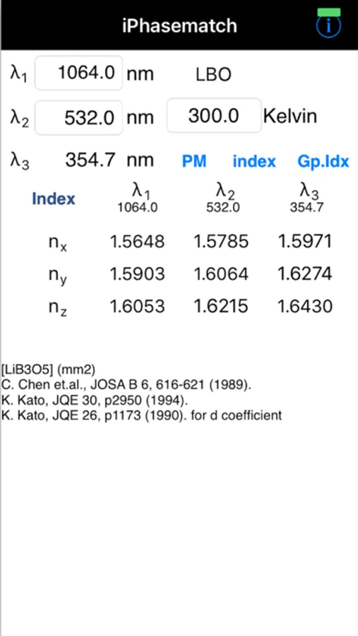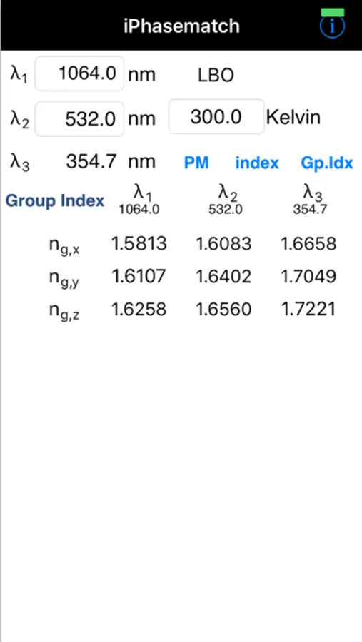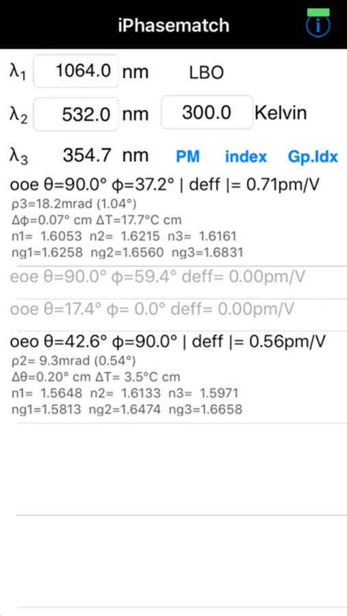 Interface should be intuitive, giving phasematching with a tap of "PM" button,refractive index with "index" button and group index with "Gp.Idx" button, for the given condition (crystal, wavelengths, and temperature).