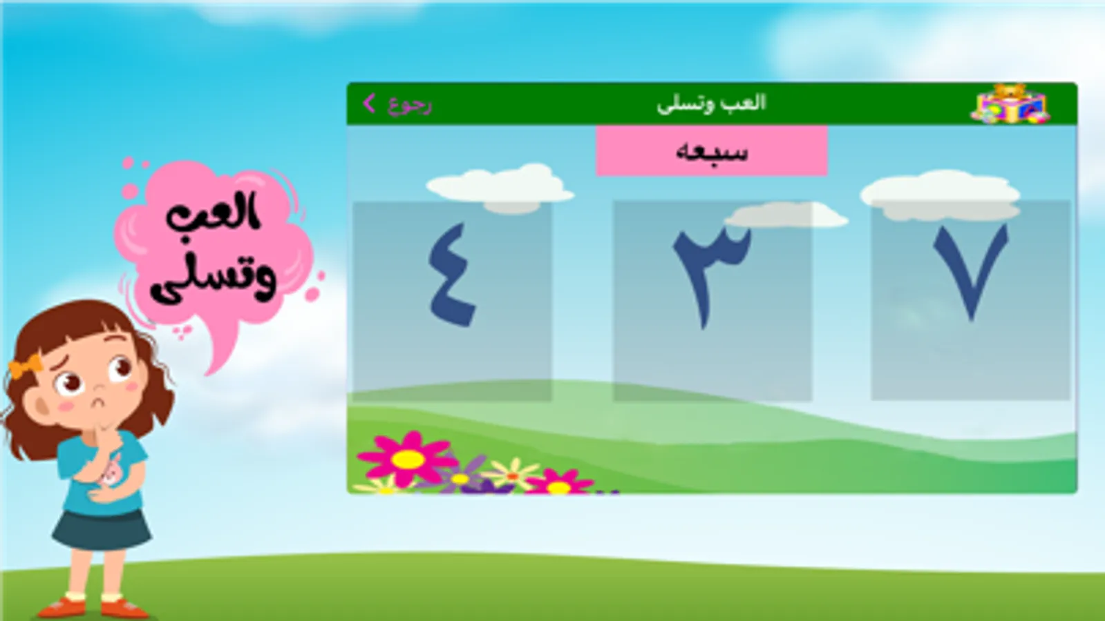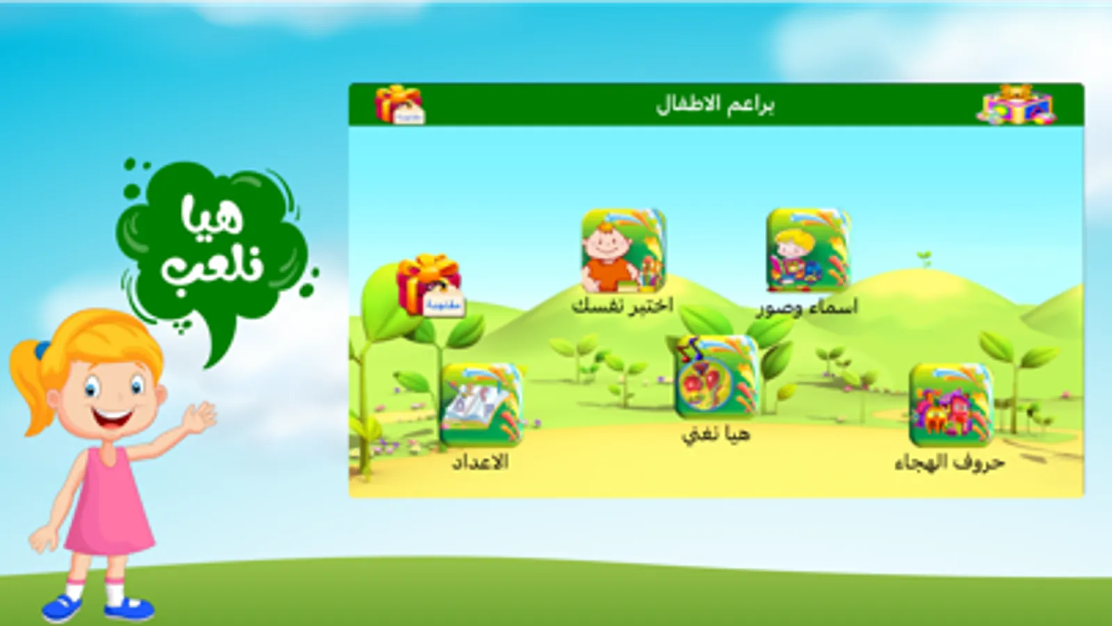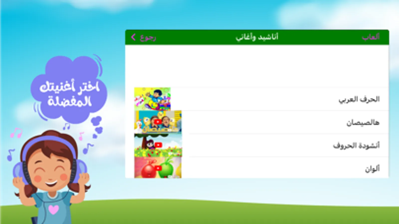 ,العاب تعليمية,الحروف والارقام,اسماء الحيوانات والطيور واصواتها,اسماء الفواكه والخضراوات,اغاني طيور الجنه واناشيد متنوعه باللغه العربيه
