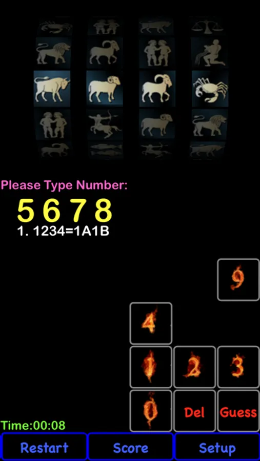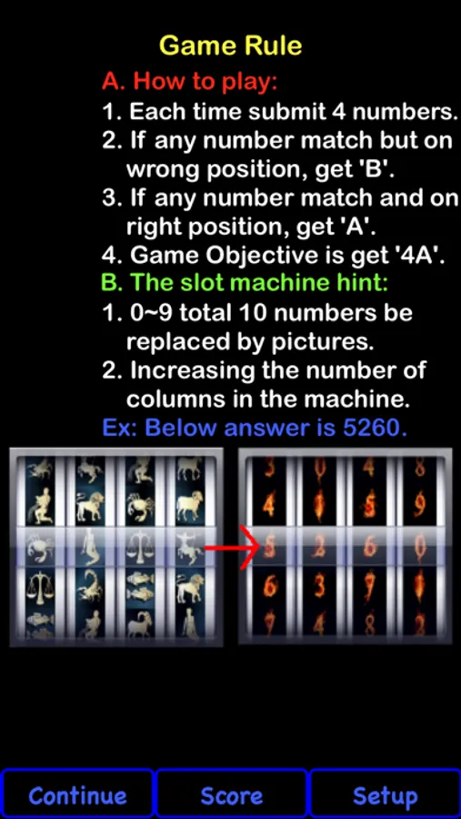 At game start, slot machine generate 4 different numbers randomly. Please find the correct number.