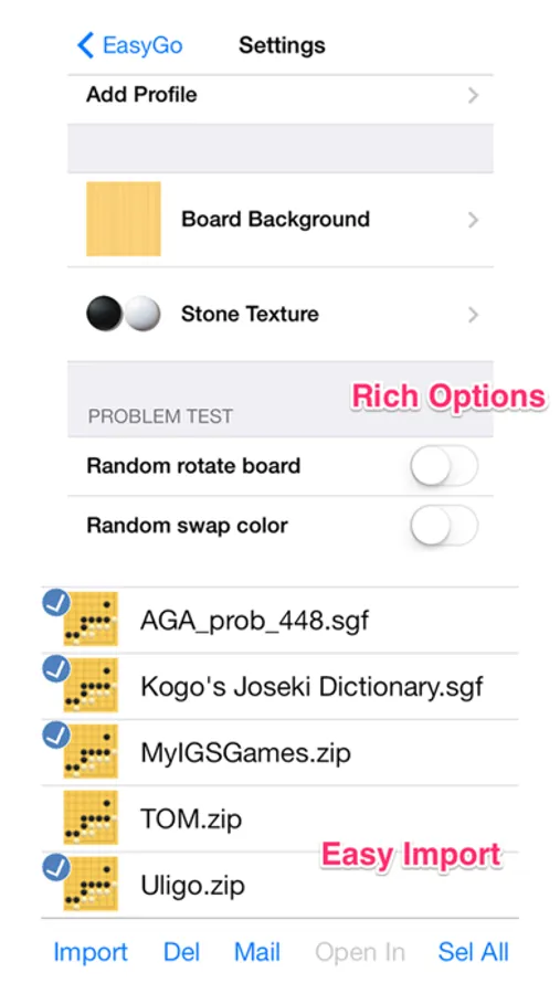 • Built in file manager, easily browse iTunes share folder, import sgf, zip files, email files
