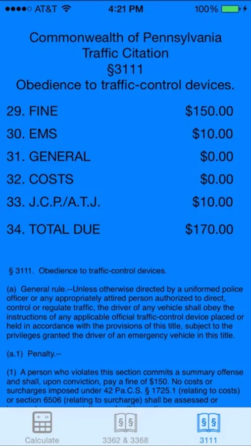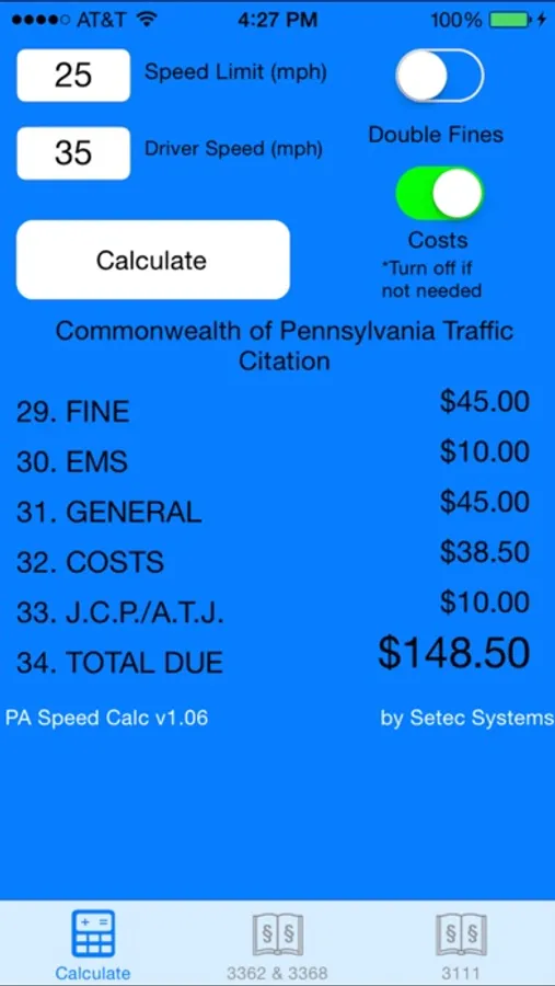 PA Speed Calc simply takes the speed limit and driver speed to calculate the dollar amounts for the various blocks on a Pennsylvania Traffic Citation when citing PA Title 75 (Vehicle Code) § 3362 Maximum Speeds. There is also a copy of § 3362 inside the application for reference while on a traffic stop. This app was developed by a Pennsylvania police officer.