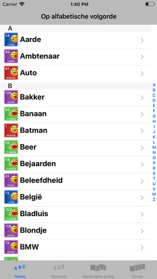 Gemakkelijk te vinden - vier groepen: Op alfabetische volgorde. Numerieke volgorde. Gemengde groep. Groep in alfabetische volgorde.