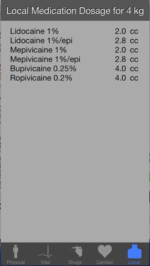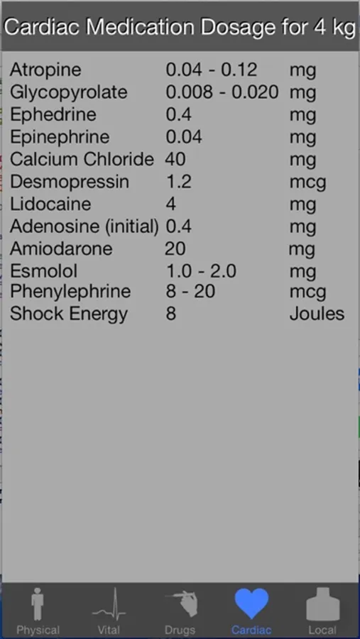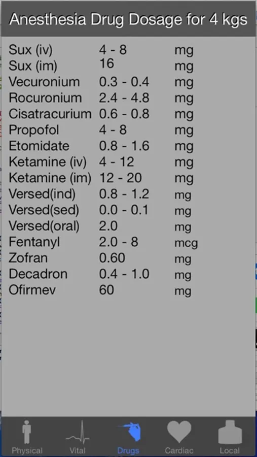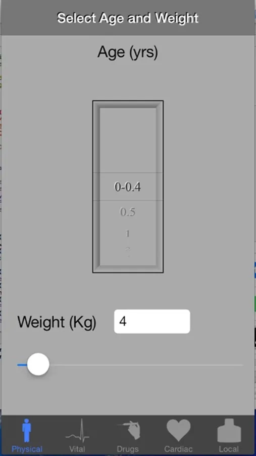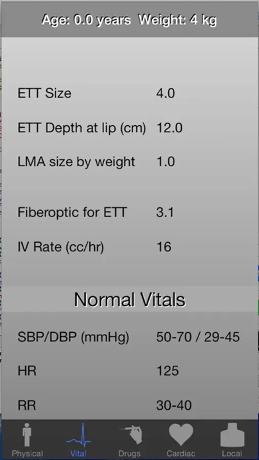 This is an all-in-one pediatric tool. Select the patient's age and it will calculate the weight. You can override the weight with your own selection. Now, you can get weight and age-specific information for your patient: ETT size, depth, fiberoptic selection, LMA size and fluid requirements. You can get weight-specific drug dosing, including cardiac medications.