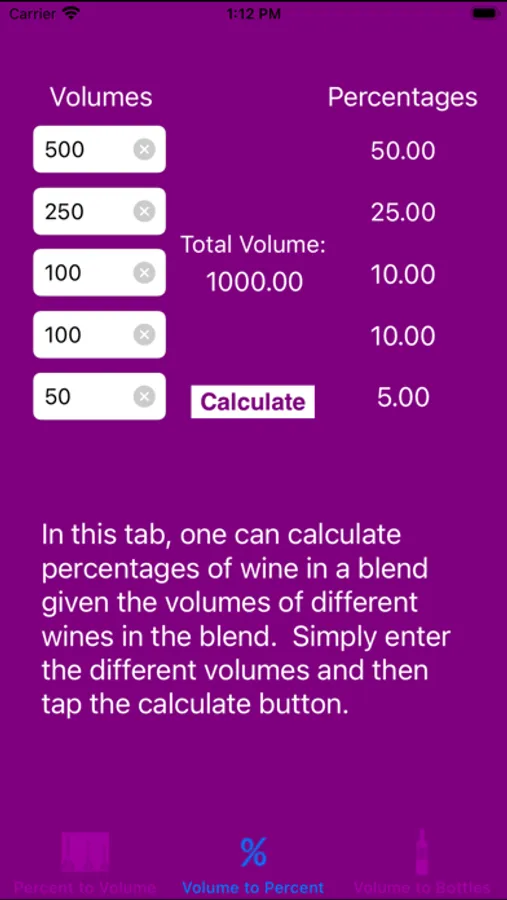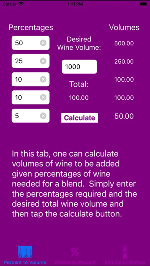 Wine Blender is an app used to calculate volumes of wine to be added given percentages of wine needed for a blend. Simply enter the percentages required and the desired total wine volume and then tap the calculate button. Additionally, one can calculate percentages of wine in a blend given the volumes of different wines. There is also a tab for calculating the number of bottles/cases required for a given number of gallons or liters of wine. Happy blending!