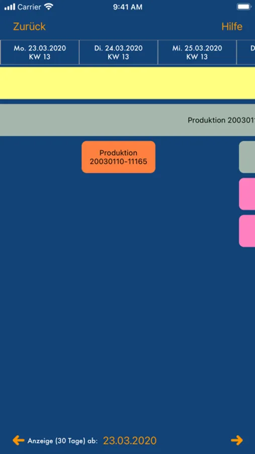 Die Produktionsübersicht zeigt in einem frei wählbarem Zeitfenster von einem Monat alle geplanten Produktionen des Unternehmens in den von der Dispo/Planung hinterlegten Farben an.