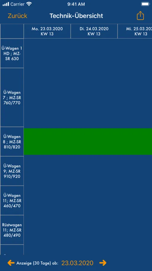 In der Technikansicht wird alle Technik des hinterlegten Master-Dienstleisters (eigene Produktionsfirma/Unternehmen), sowie die geplanten Einsätze dieser Technik in einem gantt-Diagramm übersichtlich dargestellt.