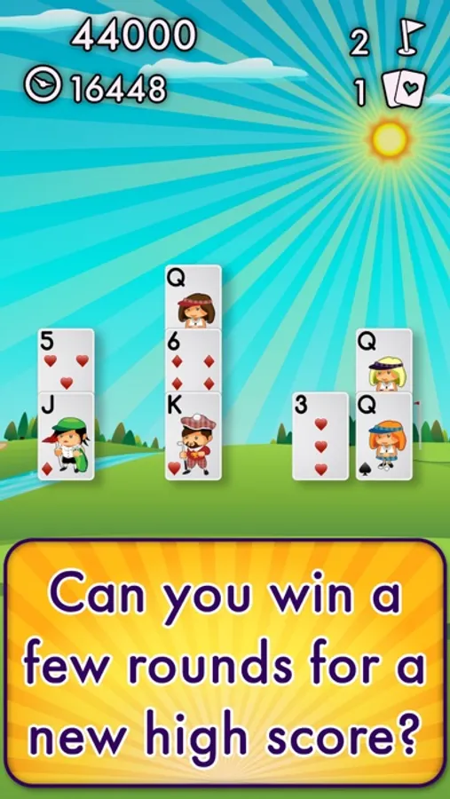 Straightforward instructions explain how the game works. To win a round, clear the cards from the golf course before the deck runs out by simply matching cards that are one higher or lower than your current card. Use wild cards to get out of tight spots! Get rid of the cards on the top line for extra, mega points! Play multiple rounds to beat your high score!