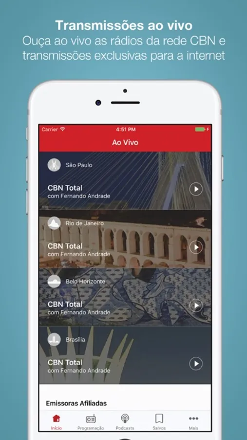 Com o aplicativo da CBN você fica atualizado com as principais notícias do dia e com a análise crítica do mais completo time de comentaristas do jornalismo brasileiro.