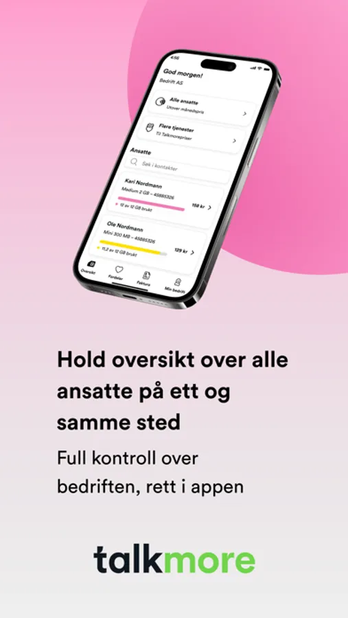 Vi i Talkmore mener at du som kunde skal kunne se, endre og administrere det du trenger helt selv – raskt og enkelt. Derfor har vi et bredt spekter av funksjoner i appen, både for deg som privatkunde og bedriftskunde.