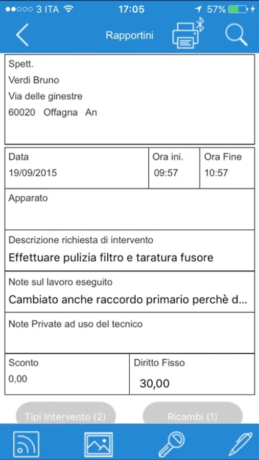 Una volta creato il rapportino, con pochi tap, è possibile assegnare il cliente, l’apparato se lo si desidera, specificare il tipo di intervento effettuato, la durata e gli eventuali ricambi utilizzati durante l’intervento.