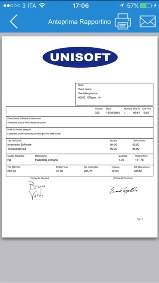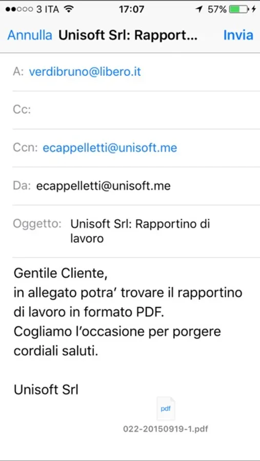 Il rapportino può essere poi stampato su stampante AirPrint o inviato in formato PDF all’indirizzo e-mail del cliente (viene anche inviata una copia all’indirizzo aziendale inserito nella schermata delle impostazioni).