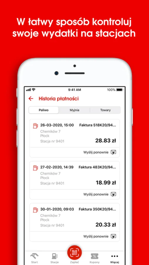 Using the ORLEN Pay application, you get the opportunity to pay for fueled up directly at the dispenser without having to visit the store. To use the service, simply register the user. You can add your payment card to the application or use other available payment methods. After refueling, use a smartphone to scan the QR code located on the distributor, confirm the transaction details and confirm the transaction with a PIN or via biometric functions. You will receive an invoice for the transaction to the email address provided during registration. In addition, you can view your transaction history, edit data, collect Vitay points or use promotional coupons. Add your ,,Biznes Tank” or ,,Karta Dużej Rodziny” cards and enjoy the discounts you have. In addition, this version of the application will allow the mobile purchase of selected goods, e.g. windscreen washer fluid. At selected stations you will also buy car wash codes.
