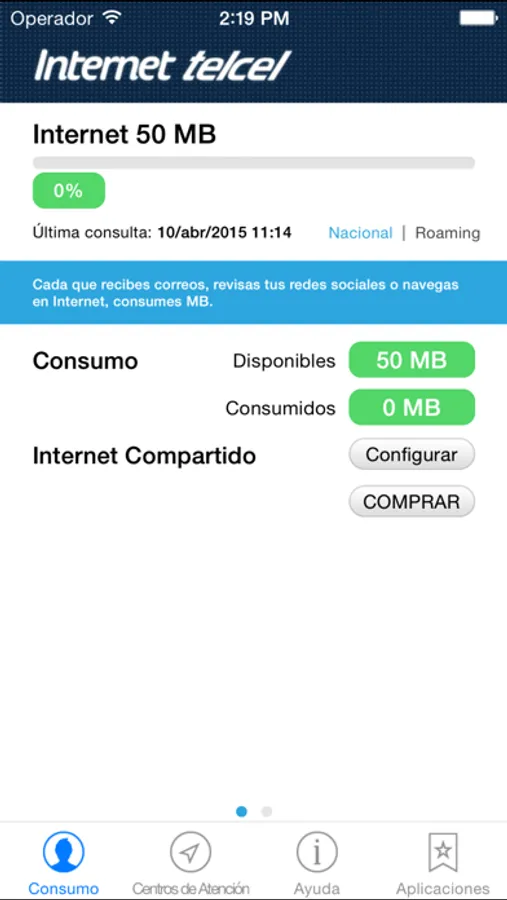 Esta aplicación te permitirá tener un mayor conocimiento sobre la navegación que realizas ya que podrás saber la cantidad de Megabytes que tienes disponibles en el momento de la consulta. La aplicación muestra la siguiente información: