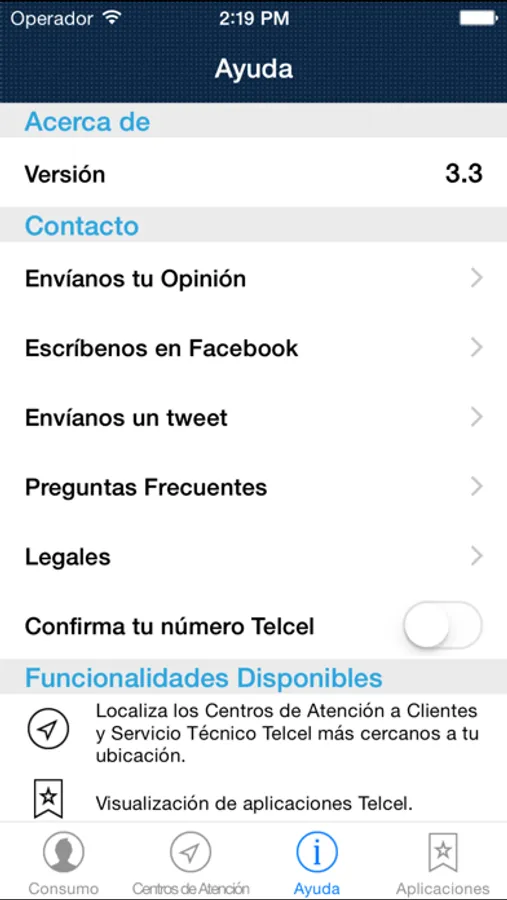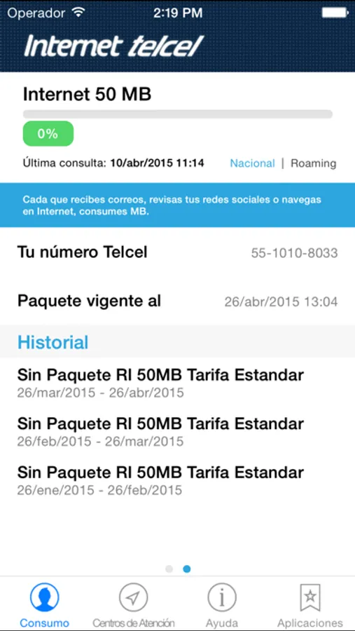 - Sección Roaming para compra de paquetes y consulta de MB.