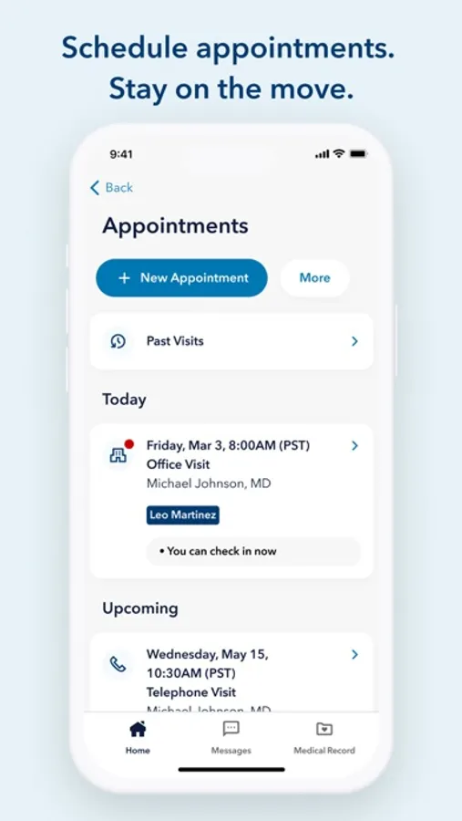 • Schedule, view, and cancel routine appointments and see information about past visits