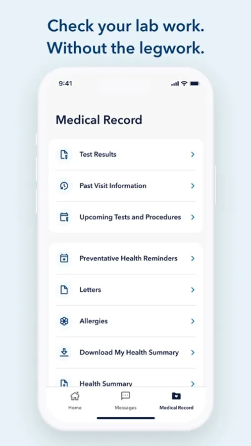 • View your medical history, including allergies and immunizations, ongoing health conditions, and most lab test results