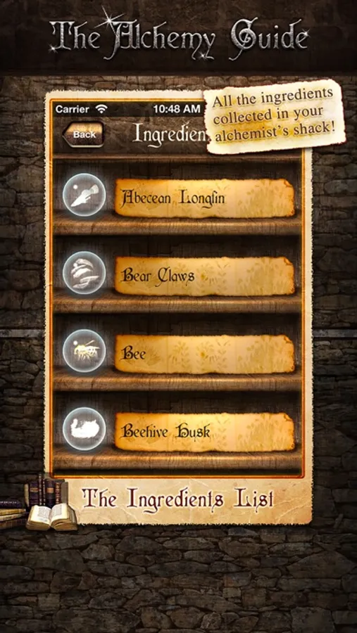 Browse the extensive database of ingredients and potion effects, check where you can find specific ingredients, then add your ingredients to the inventory and look for the most valuable potions you can create!