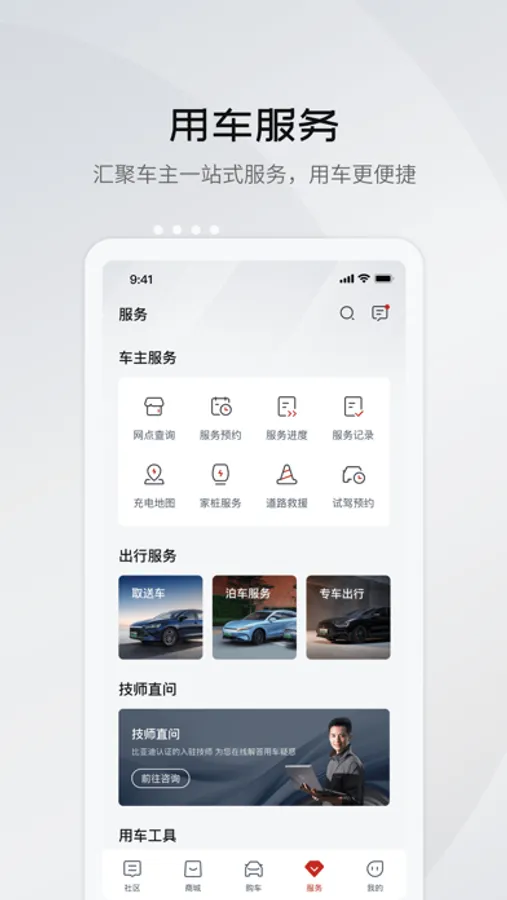 -用车服务:提供网点查询、电桩查询、服务预约、道路救援、机场泊车、取送车等一站式服务。