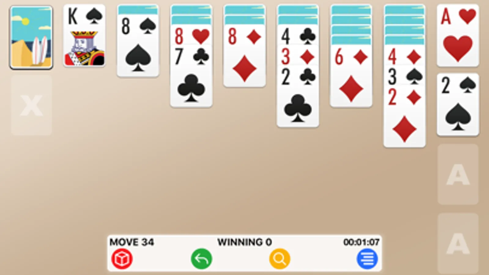 The player starts the game by shuffling and dealing the pack of cards over several piles on the tableau, or playing table. After the player has dealt, there are 7 piles on the tableau containing 28 cards. The first pile has 1 card, the second 2, the third 3, and so on up to the seventh pile. Initially, the top card of each pile is turned face up; all other cards are face down. The remaining cards that are not part of the tableau are placed in the deck-pile. Above the tableau there are five more piles that are initially empty, one discard-pile and four suit-piles, one for each suit of cards. The suit-piles (sometimes called foundations) are built up from aces to kings in one suit. They are constructed as the cards become available. The object of the game is to build all 52 cards into the suit piles through a number of allowed moves.